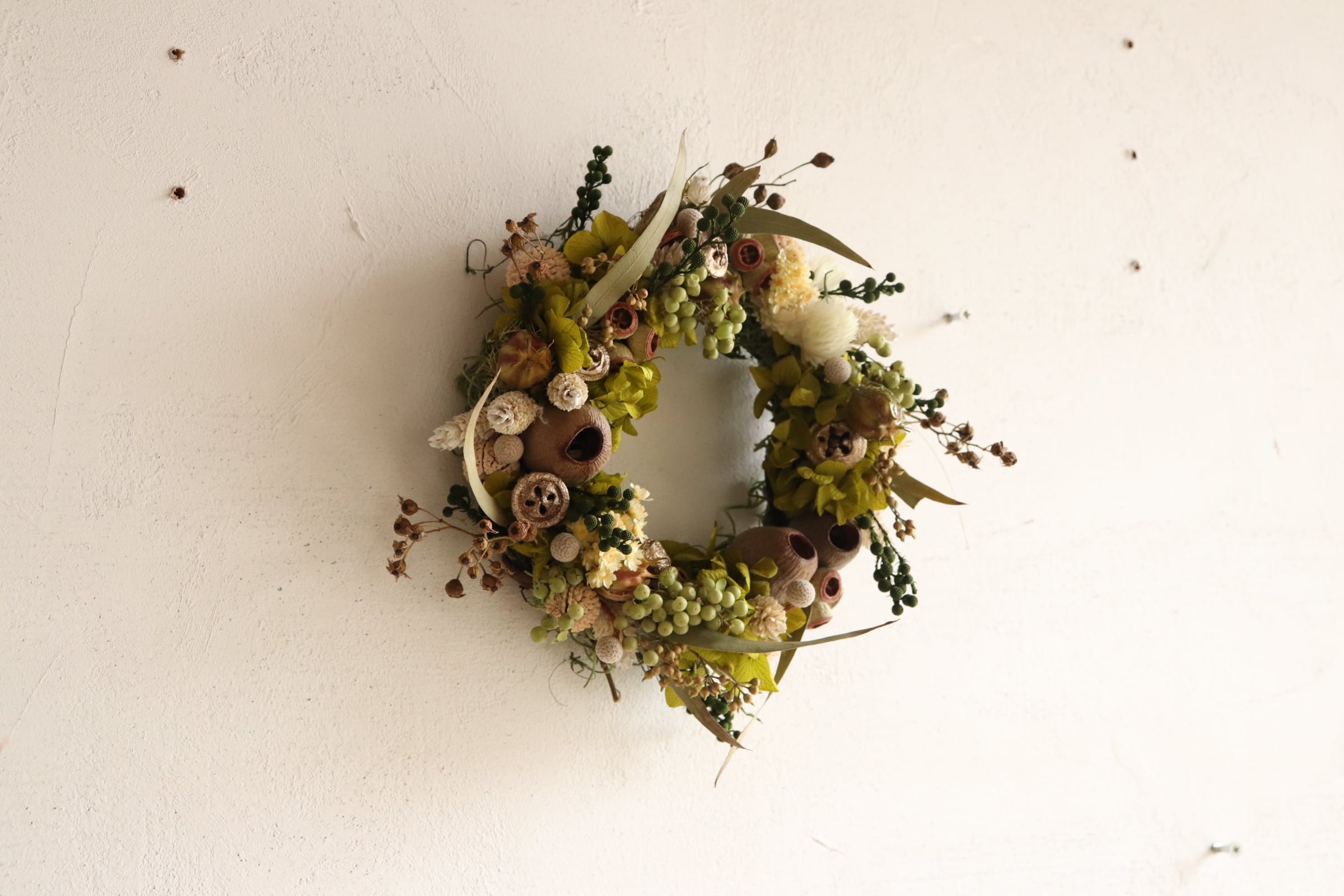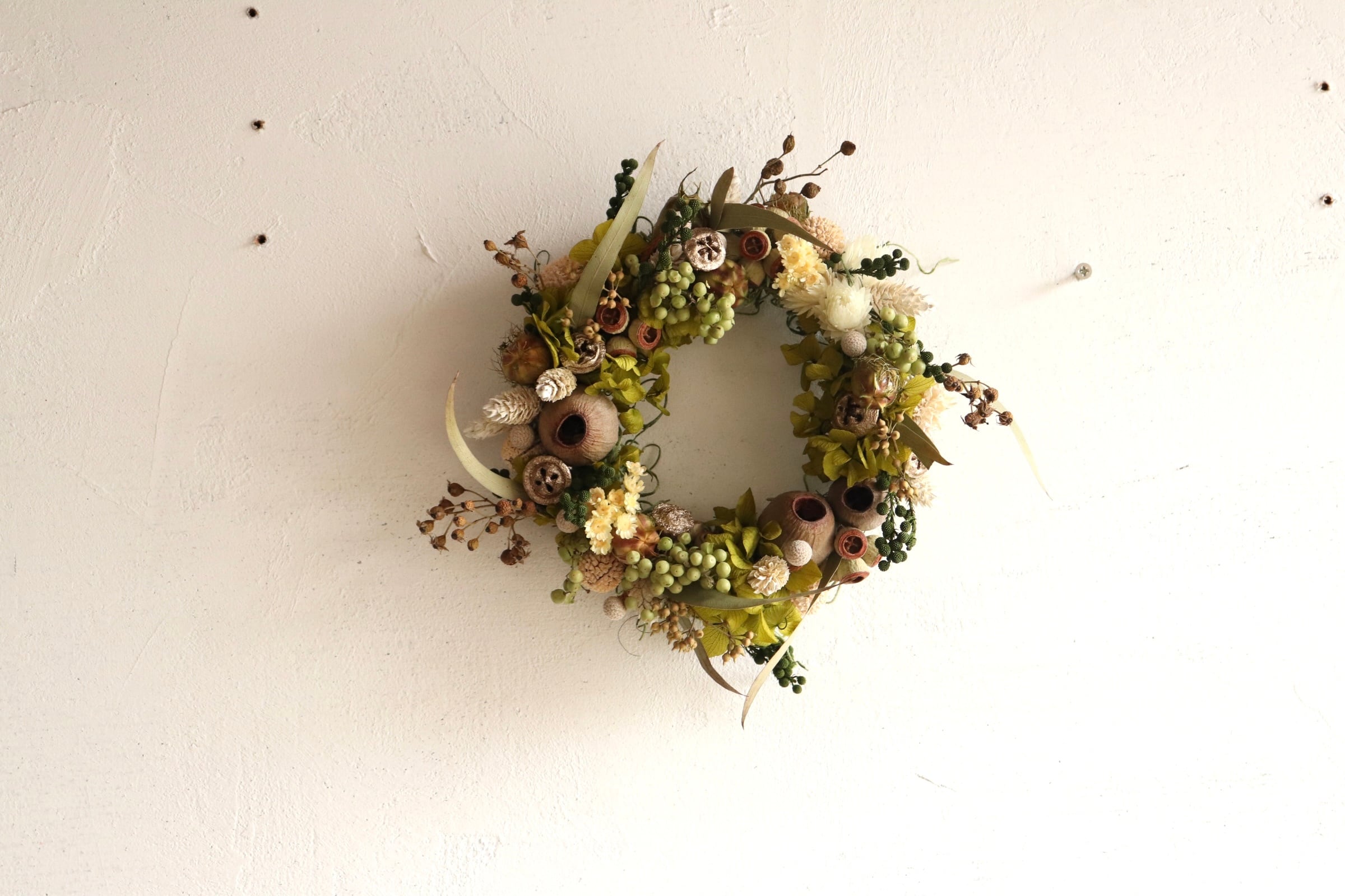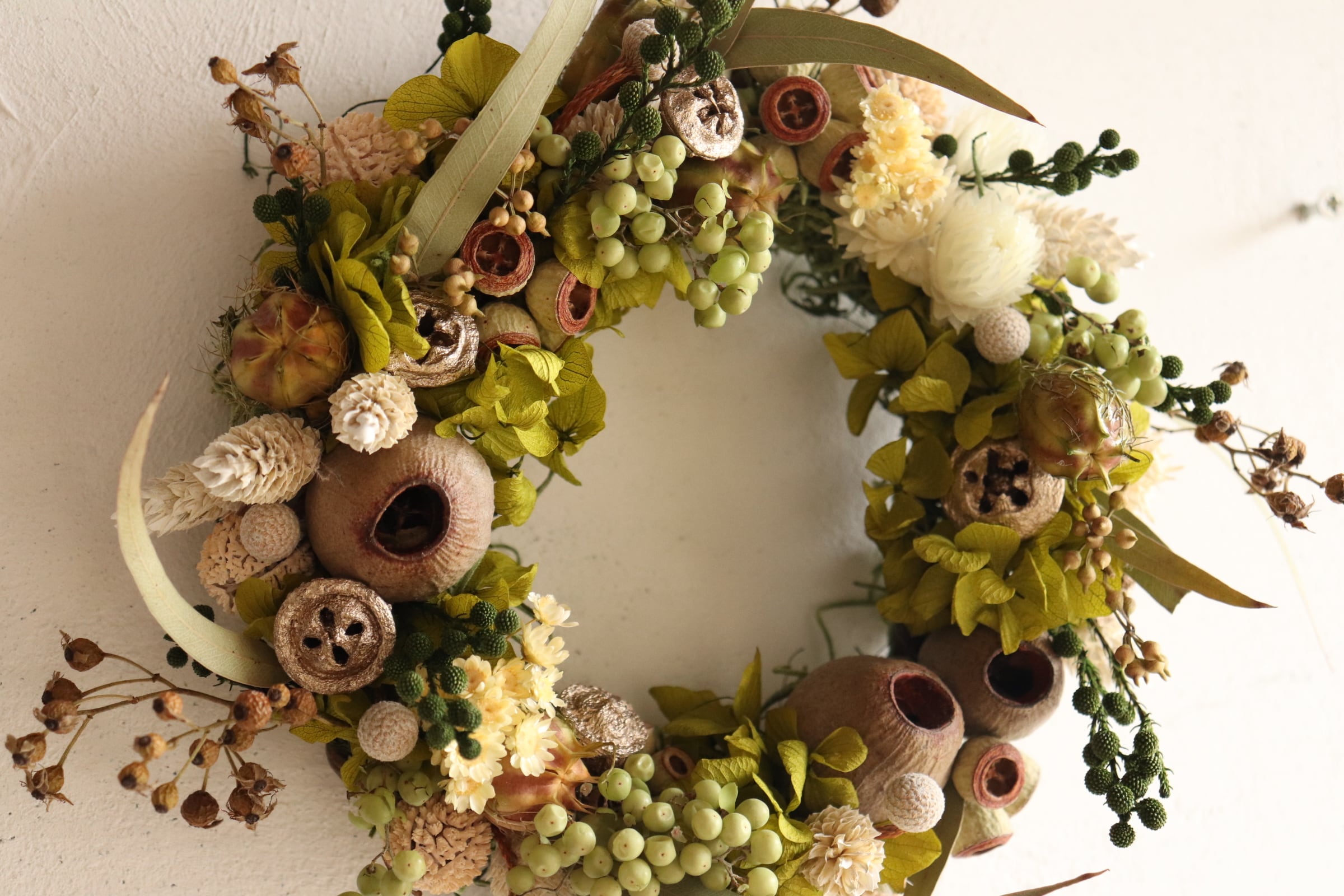 鮮やかなグリーンにさまざまな実物を組み合わせました。