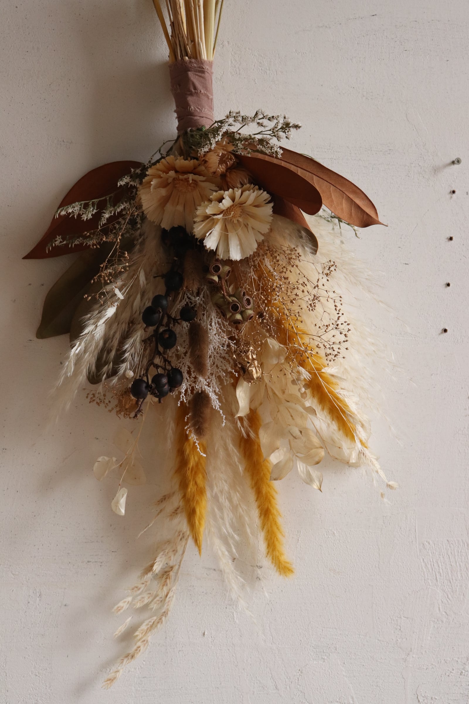 ホワイト×ゴールド×イエローで組み合わせたドライフラワーのブーケです。