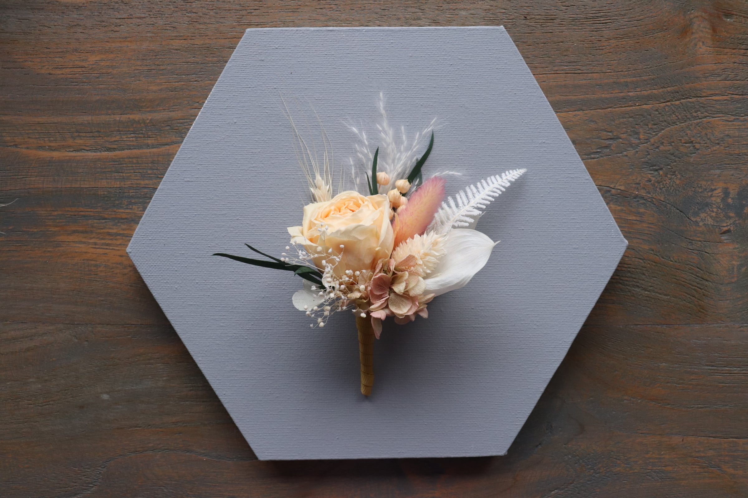 上質なプリザーブドフラワーで仕立てた一点ものコサージュ。