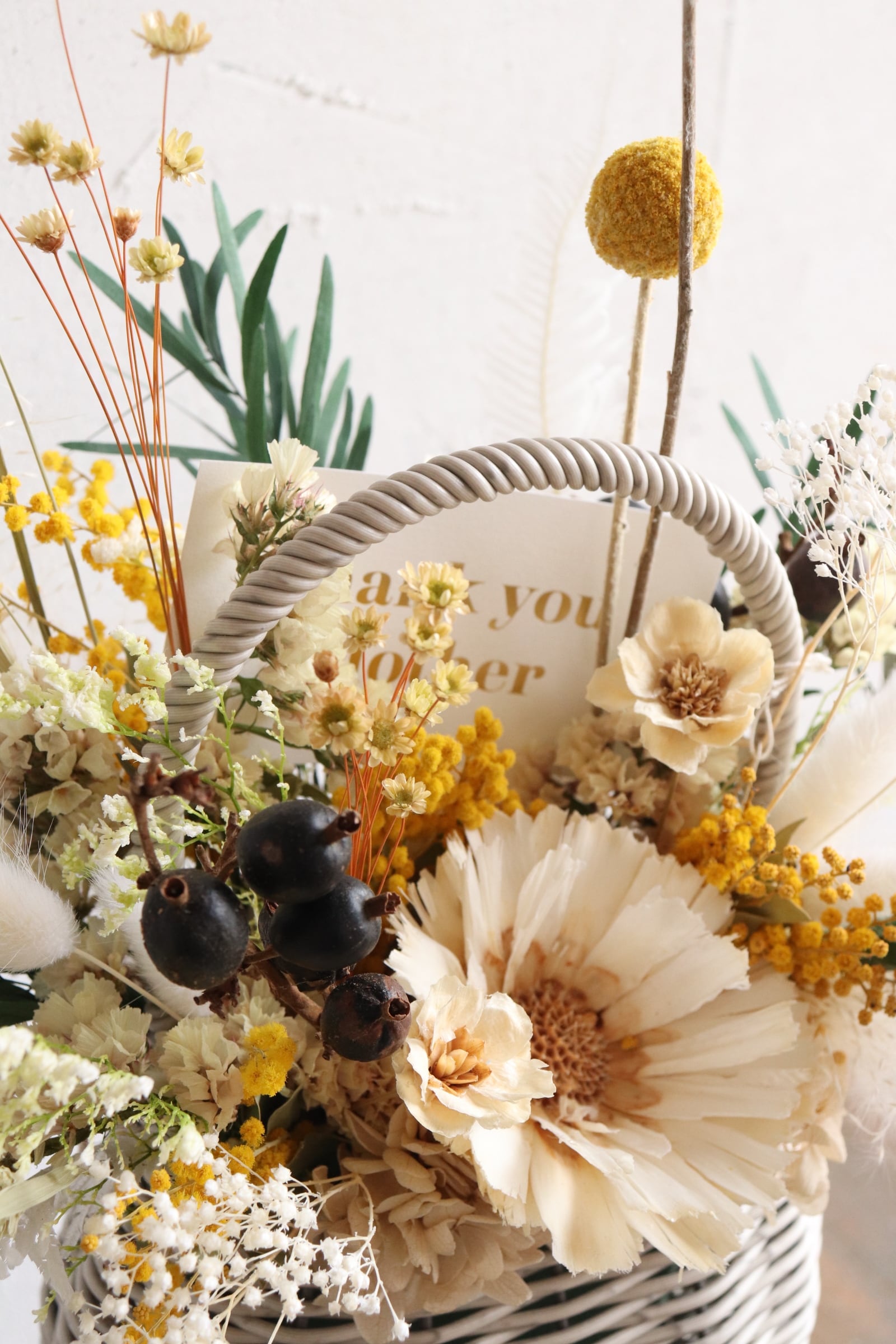こちらのお花はドライフラワーと、半永久的に持つように加工されたプリザーブドフラワーを使用しているので、長くお楽しみいただけます。